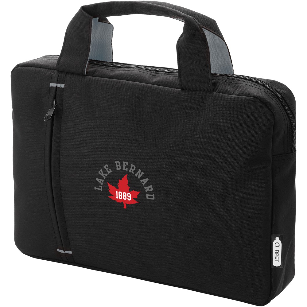 Újrahasznosított PET műanyagból készült konferenciatáska cipzáras fő rekesszel és elülső cipzáras zsebbel, megerősített felső fogantyúkkal és divatos színű kontrasztelemekkel.