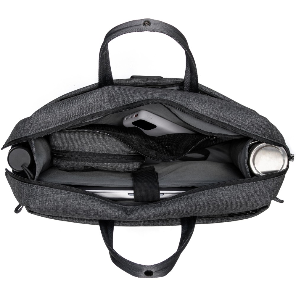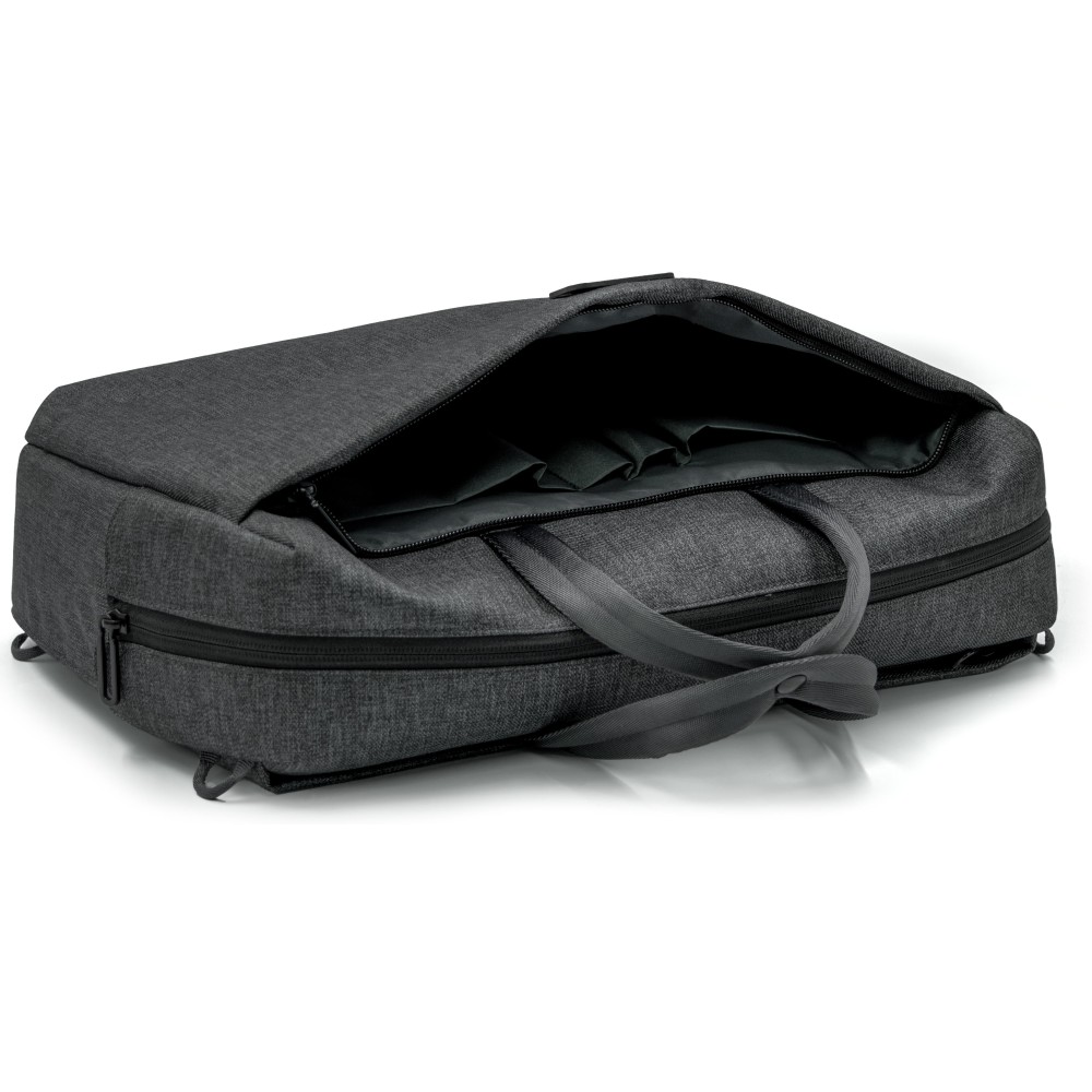 Újrahasznosított PET palackok felhasználásával készült BrandCharager laptoptáska 3 hordozási funkcióval: kézben, vállon vagy testen keresztbe vetve is viselhető. 16 -es laptop számára megfelelő tárolórésszel, több zsebbel és palack vagy esernyő számára megfelelő oldalzsebekkel, cipzáras záródássla, hordozópánttal, 4 rekesszel. Strapabíró, víz- és folttaszító anyagból készült.