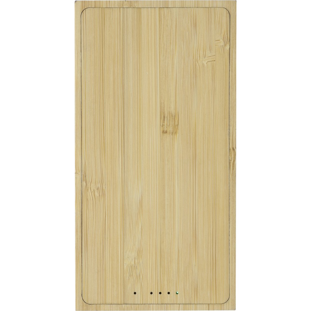 Bambusz napelemes powerbank 10.000 mAh kapacitással, dual USB-A és USB-C porttal, vezeték nélküli töltés funkcióval, beépített napelemes panellel és 5 db LED jelzőfénnyel. 30 cm-es fehér kábel tartozik hozzá. Csomagolása barna papírdoboz.