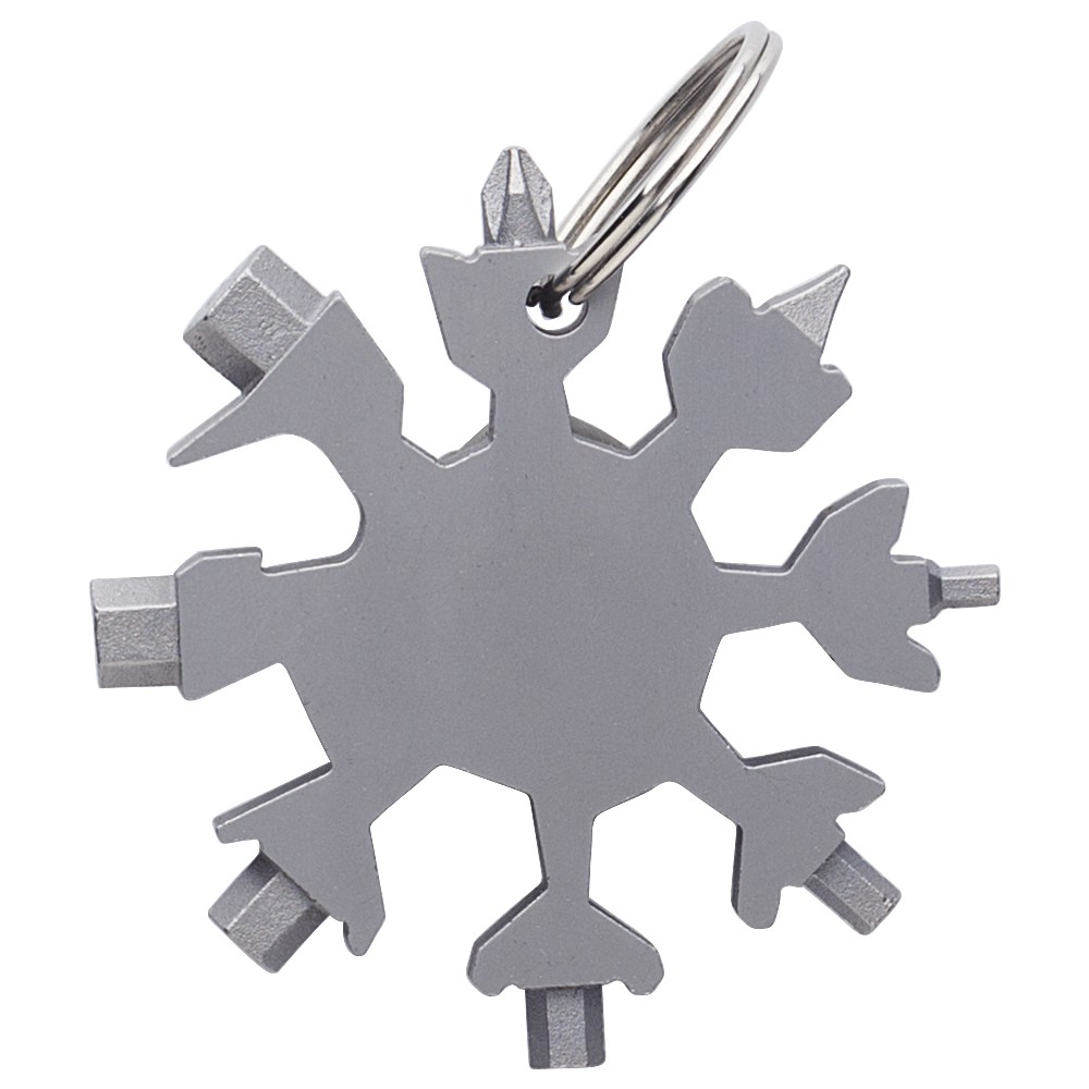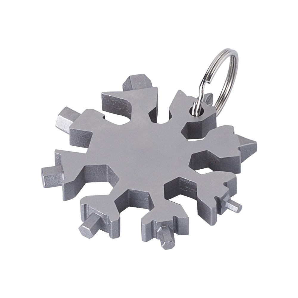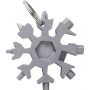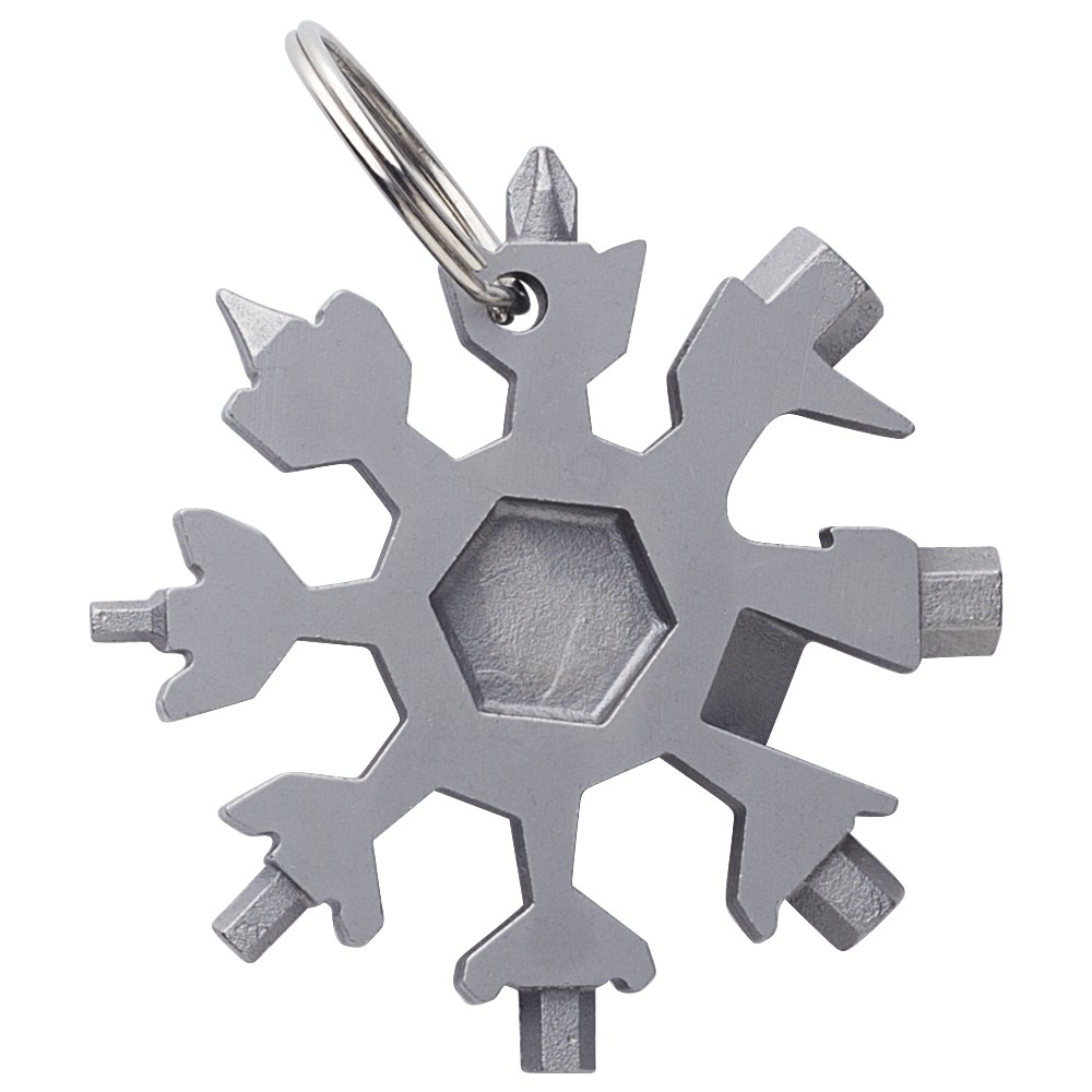 17-in-1 fém szerszámkészlet hópihe formában, kulcstartóval. Csomagolása barna papírdoboz.