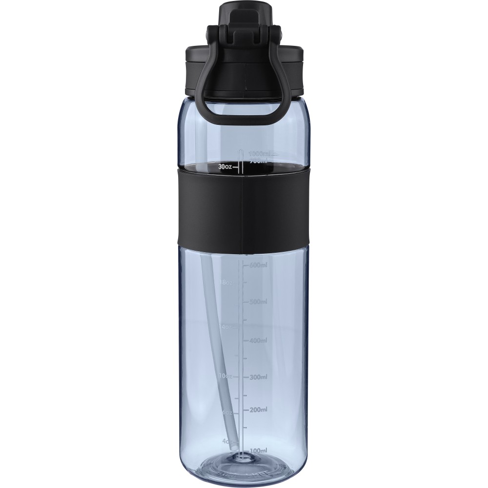 Tritán kulacs, 900 ml-es. Kétféle használati lehetőséggel: csavaros záródású kupak vagy visszahajtható végű szívószál. Szilikon markolattal, PP hordozófüllel és nyomtatott űrtartalom-jelzővel.