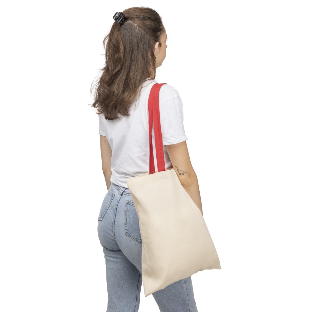 Oeko-Tex minősítésű, 140 g/m2 pamutból készült bevásárlótáska natúr színben, színes fülekkel. Mérete 38 × 42 cm, a fülek hossza 70 cm, szélessége 2,5 cm. Oeko-Tex címkével ellátva.