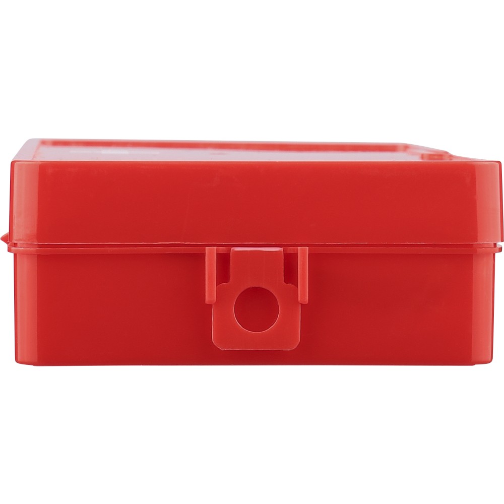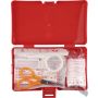PP anyagból készült elsősegélykészlet piros tokban, a felső részen fehér kereszttel és csatos záródással. Tartalma: 2 nemszőtt törlőkendő, 5 ragtapasz, 4 alkoholos törlőkendő, 1 olló, 1 tekercs 450 cm hosszú gézkötés és 1 tekercs 450 cm hosszú ragasztószalag.