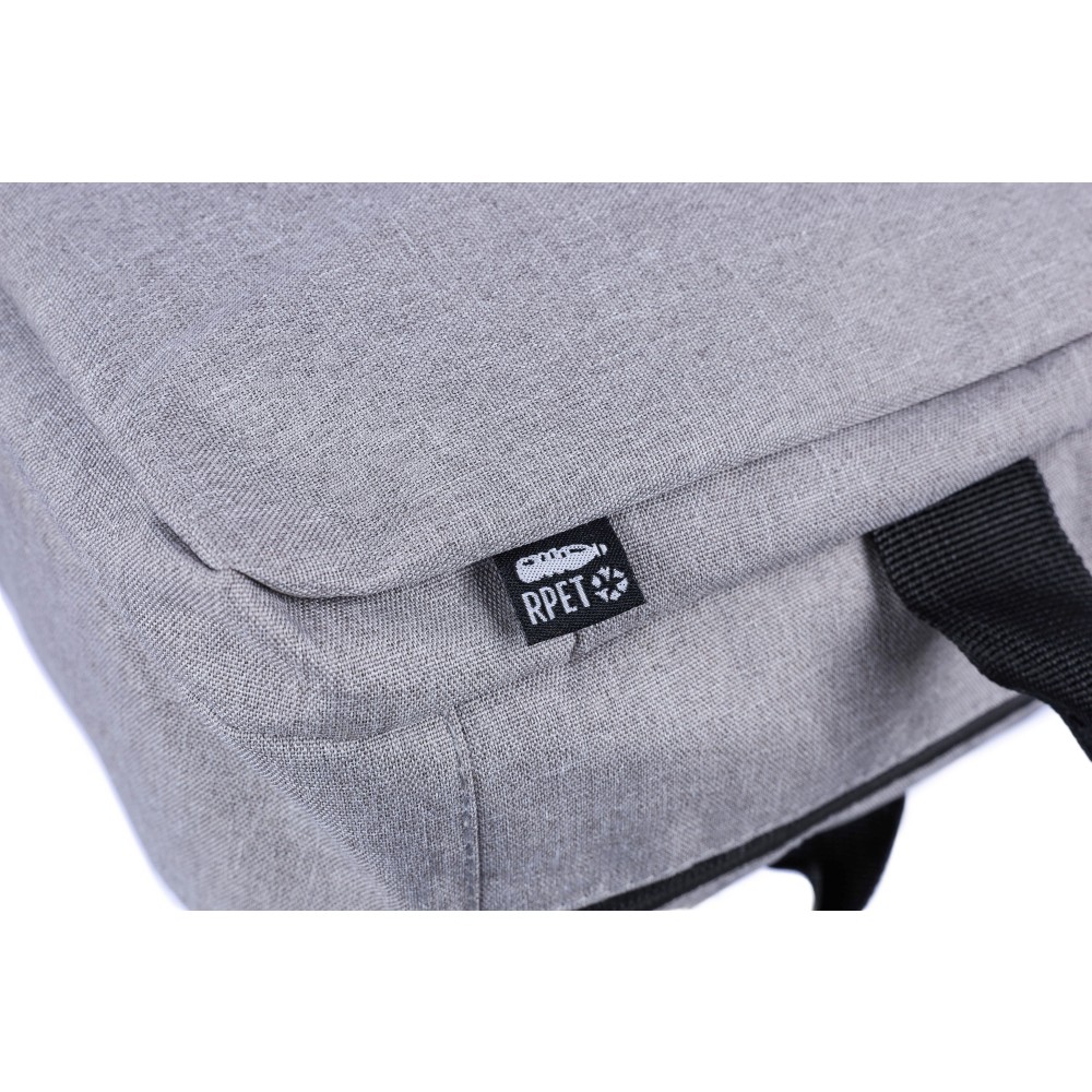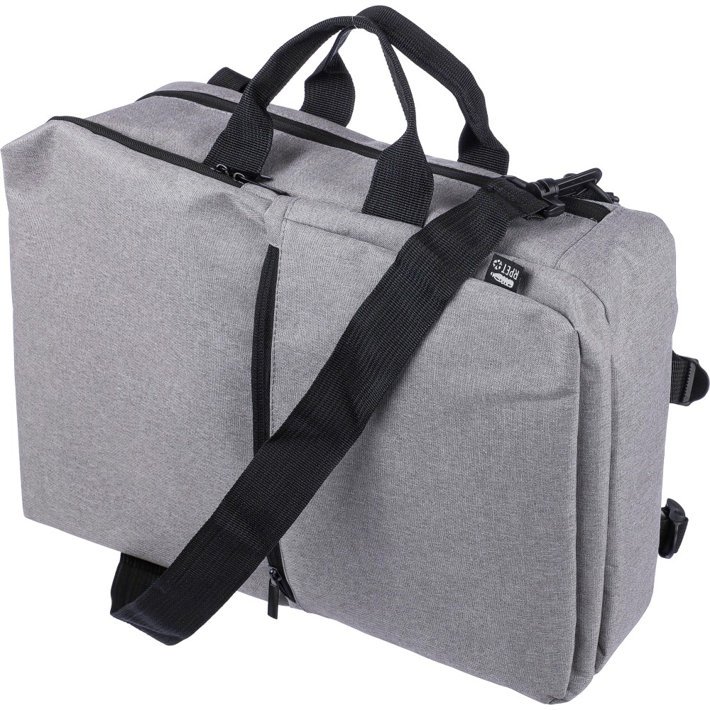 Hátizsák és laptoptáska 15"-es készülékhez. Kézipoggyász méretű. Hordozófüllel a tetején, állítható vállpántokkal és két oldalsó fogantyúval. Az állítható pántok a párnázás mögé rejthetők, így az oldalsó fogantyúkkal is hordozható. Tépőzáras laptoprekesszel és kis cipzáras zsebbel rendelkezik. Szellőző, párnázott hátoldallal. Terhelhetősége kb. 8 kg. RPET alapanyagra utaló címkével. Anyaga: 300D RPET poliészter.