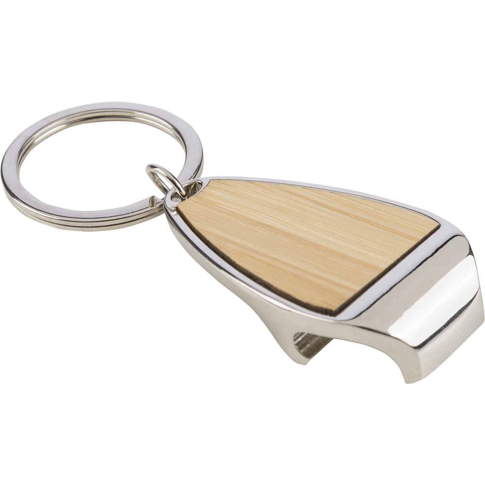Cinkötvözetből készült kulcstartó fém kulcskarikával és elülső oldalán bambusz betéttel, sörnyitó funkcióval. Papírtasakba csomagolva.