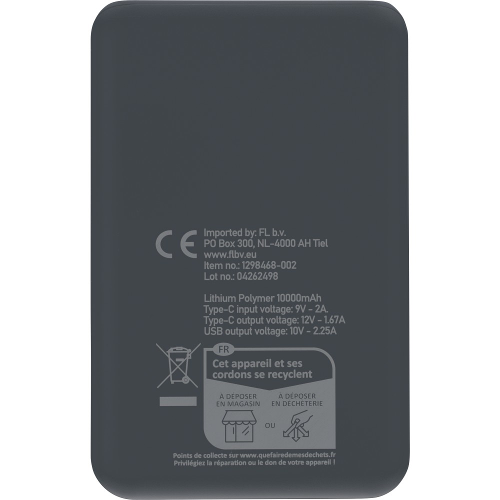 Újrahasznosított ABS anyagból készült powerbank 20 000 mAh kapacitással és 22,5 W gyors töltési teljesítménnyel. Type-C in/out és Type-A bemenettel, LED visszajelzővel és biztonsági védelmekkel. A hátoldalon gravírozott recycled (újrahasznosított) alapanyagra utaló logó található. Selyempapírral bélelt barna dobozba csomagolva.