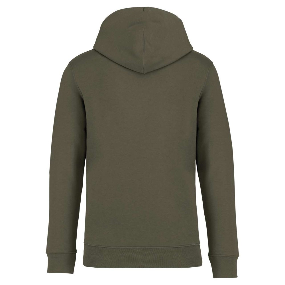 85 % bio, fésült pamutból és 15 % újrahasznosított poliészterből készült. Unisex. Egyenes szabás. Méretcímke organikus pamut és újrahasznosított poliészter logóval. LSF (Low Shrinkage Fleece: előzsugorított polár) kezelés. Kapucni. 1x1 bordás szegély és kézelő. Duplatűzés a kézelőn, a szegélyen és a nyaknál. Szalagozott nyakbelső hátul. Bélelt kapucni, a nyaknyíláson nincs felülvarrás, csak egy megkötés, hogy a húzózsinór a felső részen maradjon. Kerek húzózsinór a kapucnin fém véggel. Kenguru zseb. Nincs márkajelzés a nyakrészen, csak egy méretcímke a könnyű dekorálás érdekében. Karton függőcímkével érkezik, amely felsorolja a termék előállításához felhasznált környezetbarát anyagokat. Organikus pamutfonal. OEKO-TEX N CQ1007/7 STANDARD 100 tanúsítvánnyal rendelkezik. IFTH. 350 g/m2.